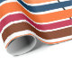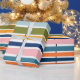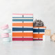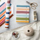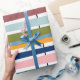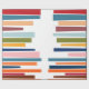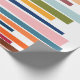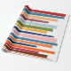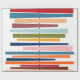 This wrapping paper has a mid-century modern design of horizontal colored lines on a vertical black line with circles.
