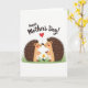 This greeting card shows two small, spiny woodland creatures at the lower center, standing on a little patch of green grass and facing each other with their noses nearly touching in a tender, friendly way ❤️. Their bodies are light tan, and their backs are covered in short brown quills with slightly lighter tips, giving them a soft, textured look. A thin string rises between their snouts to a red, heart-shaped balloon, as if they’re sharing it together. Near their feet, a single yellow daisy with an orange center adds a gentle, sunny accent 🌼. The background is plain white, making the warm earth tones and bright red balloon stand out clearly. Across the top, the words “Happy Mother’s Day!” are placed prominently in a dark, hand-lettered style that’s easy to read. The layout feels balanced, with the text above and the two creatures and balloon forming the main focus below. The red heart balloon floats above them, centered between their faces, with the daisy sitting slightly off to one side on the grass.