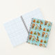 A spiral-bound notebook features a playful pattern on a light blue background. The design includes children in animal costumes, colorful mushrooms, a rabbit, and picnic baskets. The cheerful illustration conveys a whimsical, outdoor adventure theme.