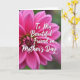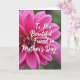 On the front of the card a large fuchsia flower fills the frame, its many petals opening in layered rings that draw your eye inward. The petal tips fade to softer pink highlights, giving the bloom a velvety look, like a gentle hug captured in color ❤️. Soft, diffused lighting smooths the shadows and makes the rich pink tones glow without feeling harsh. Behind the flower, a deep green background is blurred and muted, keeping the focus on the blossom and adding a calm, intimate setting. Across the upper middle of the flower sits the message “To My Beautiful Friend on Mother’s Day” in flowing white lettering, easy to read against the pink. The words feel like they’re resting lightly on the petals, adding a friendly, affectionate touch 🌼. At the center, the flower’s heart forms a tight spiral of tiny florets in vivid pink, like a swirling rosette.