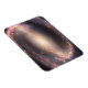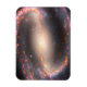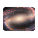 Spiral galaxy NGC 1300. Radio light is represented in yellow and highlight the clouds of cold molecular gas that provide the raw material from which stars form. Red and magenta colors capture the impact of young, massive stars on their surrounding gas. Visible and ultraviolet light highlight dust lanes in gold and very young, hot stars in blue.