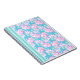 A pretty and feminine spiral notebook, with a pattern of bright pink roses on a sky blue background and matching sky blue blue and soft green stripes.