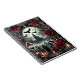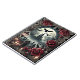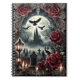 This image shows a landscape inspired by the Gothic esthetic, combining dark tones, dramatic contrasts, roses and decorative details. In the center of the picture is a mystical castle in the light of the full moon, a cemetery in the foreground and red roses framing the view. The black birds flying in the background add a dark atmosphere to the scene.