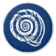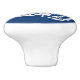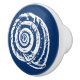Knob in a block print pattern, based on a spiral seashell, in white on a cobalt blue background