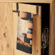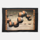Kitchen towels with moody light shining on a motionless segment of simple globe and pitcher shaped terracotta wind chimes that are set in a spiraled effect. This photo is framed by a thin orange line with a tribal-like digital art design along the top and bottom and a wide black border. The image was altered with photo editing software for a distressed effect.