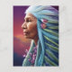 Beautiful postcard features an AI generated digital painting of an old serene spirit like Native American woman in stunning details including pastel and blue hair with flowers and a orange and purple sky colored background.