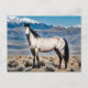 A beautiful wild horse stands looking at the viewer as if deciding whether or not to run, with snow-capped mountains in the distance, and sagebrush in the foreground. A beautiful work of Western Americana