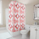 This shower curtain has a geometric design of concentric circles in shades of red forming two squares on a field of white.