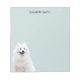 Image of a cute fluffy white American Eskimo Spitz breed type dog in the lower left corner, set on solid pale blue. Personalize with your name or message in black minimalist font.