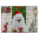 Spitz Dog Christmas sitting outside decorated home with Christmas wreath, Christmas tree is a perfect Christmas gift idea for dog lovers.