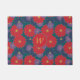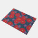 Large scarlet red, medium navy blue, and small royal purple daisy-like flowers are scattered across a rich jungle green background to create a colorful floral pattern that is perfect even for autumn. Customize the monogram on this doormat to create a personalized decoration for your entryway.