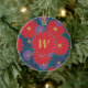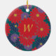 Large scarlet red, medium navy blue, and small royal purple daisy-like flowers are scattered across a rich jungle green background to create a colorful floral pattern that is perfect even for autumn. Customize the monogram on this ornament with your initial to make it uniquely your own.