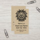 Vertical style card with heavy black outlined sun in its splendor image. The sun has a typical medieval face and extra fiery rays surrounding it. The background is a medieval parchment style effect image.