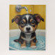 Adorable pets sitting in a bathtub, with water droplets and bubbles around it. The puppy looks at the viewer with wide, innocent eyes, and its little paws rest on the edge of the tub. The overall atmosphere is cute and humorous, making it ideal for a poster set.