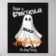 A playful Halloween poster featuring a cheerful cartoon ghost with bold "BOO!" lettering across its chest. Set against a dramatic black backdrop, the design pops with whimsical typography and festive colors. The top and bottom text create a lively seasonal message, while the family name area is fully customizable—perfect for adding a personal touch to your haunted hello. Ideal for spreading spooky cheer with charm and flair.