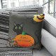 A halloween pillow with a spooky yet cute scene of a black cat standing behind a pumpkin under a full moon. Bats are flying over the cats head.