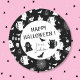 Spooky cute black and white kid round Halloween stickers with child's name . They feature a border pattern , as well as a ghost , cat ghost and two bats . Ideal to seal treat bags or to hand out as party favors .