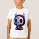 This collectible figure combines elements of spookiness and cuteness. It features a stylized skeleton with an oversized head, wearing a black cloak with horns. The figure has large, hollow eyes and a white skull-like face with a melting effect. , it holds a small orange pumpkin basket, reminiscent of Halloween trick-or-treating.