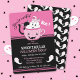 Spooky cute pink and black kid-friendly Halloween party invitation featuring a whimsical ghost in a jack-o-lantern mug and a bashful black cat hiding behind it . The provided template makes it easy for you to personalize it with your own info . The back is black with a simple white ghost pattern .
