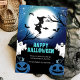 Get ready for a night of spooktacular fun! This classic Halloween party invitation sets the perfect haunted mood for your celebration. The design features a dramatic silhouette of a witch on her broomstick, flying across a giant full moon in a starry night sky. Bats swarm around her, while spooky ghosts and grinning blue jack-o'-lanterns stand guard below. With its eerie blue glow and fun, spooky details, this invitation is perfect for a costume party, a kids' Halloween bash, or any celebration where ghouls and goblins gather!