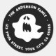 Round Halloween return address labels featuring a spooky, white ghost and customizable template fields for your name and address.