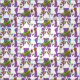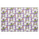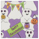 Holding pumpkin buckets and "Happy Halloween" signs, these cute trick or treating ghosts are ready for a spooky Halloween! Background is purple swirls. Perfect fabric for Halloween DIY projects.