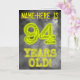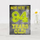 The front of this eerie looking, editable birthday card design features the message "94 YEARS OLD!" with characters and digits having a mysterious glowing aura inspired look, on a spooky grey cloudy mist-inspired background pattern. The front also features a personalized recipient name. The inside features a customizable birthday greeting message. A customized birthday greeting card like this might be given to celebrate somebody’s 94th birthday. [~Z0000365]