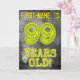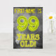 The front of this spooky looking, customizable birthday card design features the message "99 YEARS OLD!" with characters and digits having an eerie glowing aura inspired appearance, on a mysterious grey cloudy mist-inspired background pattern. The front also features a personalized recipient name. The inside features a personalized birthday greeting message. A customizable birthday greeting card like this might be given to commemorate somebody’s 99th birthday. [~Z0000365]