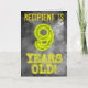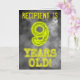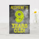 The front of this mysterious looking, editable birthday card design features the message "9 YEARS OLD!" with characters and digits having an eerie glowing aura inspired appearance, on a spooky grey cloudy mist-inspired background pattern. The front also features a personalized recipient name. The inside features a customizable birthday greeting message. A customizable birthday greeting card like this might be given to somebody celebrating their 9th birthday. [~Z0000365]