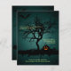 Enclosure card is a stunning Halloween party invitation shows a leafless tree, a flying black bat, and a glowing orange pumpkin beneath the tree. The background is green, distressed grunge. Create a spooky, eerie mood with this invite. Two-sided, with text on one side. The text is customizable. Personalize it to make it your own.