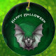 This hanging ceramic ornament has a spooky grey bat with wings spread in flight in front of a haunted glowing green cave. Customise the Happy Halloween text with the template.