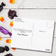 Send spooky, whimsical Halloween greetings with this cute watercolor Halloween postcard! The design features a playful Grim Reaper walking through a creepy cemetery, his sickle in hand, while a black crow perches atop a skull. “Happy Halloween” pops in festive style with a Jack-o-Lantern pumpkin, a witch hat, spiderwebs, a bright yellow full moon with a fluttering bat, and a scary ghost, the perfect mix of fun and spine-chilling charm.