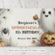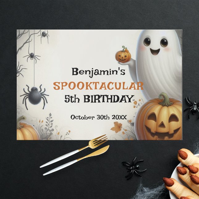 This Halloween-themed birthday party paper placemat is a delightful fusion of spooky and celebratory elements. A friendly ghost with outstretched arms welcomes guests. It adds a playful touch without being too scary. A carved pumpkin with a friendly face adds to the Halloween vibe. Spiders and intricate webs stretch toward the corner, creating a classic spooky atmosphere. You can personalize the text to match your event.