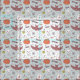 This design is a Halloween-themed pattern with a whimsical and playful design. The background color is a soft pastel blue, and it is filled with various Halloween icons and symbols.