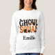 Spooky Halloween custom name sweatshirt for friends. The design features the text "Ghoul Squad" in black and orange motif-style typography with orange, yellow and black Halloween elements like witch hat, pumpkin and skulls. Makes for the best personalized gift for your best friend. Perfect to make them feel special, boost their confidence and get a unique and sassy gift! We even have sweatshirts, keychains and shirts with the same design in our collection. Please check it out. Happy Halloween!