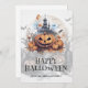 Beautiful Halloween card featuring a haunted house, pumpkins and bats. Easily personalize this watercolor Halloween card with your family name and text.