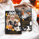 Send delightful Halloween greetings with this adorable "Boo!" photo Halloween greeting card! Featuring a playful design with whimsical elements like ghosts, pumpkins, a crescent moon, and a witch's hat, this card captures the festive spirit of Halloween in white and orange on black. The bold "Boo!" text adds a fun touch, making it perfect for sharing spooky fun with friends and family. This card is fully customizable, allowing you to personalize all colors to match your style or theme. The front provides a space for your favorite photo, framed by cute Halloween illustrations, making it a memorable keepsake. Whether it's a picture of your pet dressed in a pumpkin costume or your baby in a skeleton outfit, this card will surely bring smiles. The back of the card continues the theme with a space for a friendly Halloween message and photo, surrounded by more festive elements. Ideal for sending warm wishes and spooky greetings, this card combines cuteness, customization, and Halloween fun in one charming design.