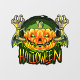 Scary jack-o-lantern with bat wings and claws in neon orange, green, and yellow.