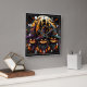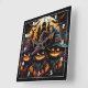 Three colorful scarecrows with glowing pumpkin heads theatrically display eerie charm, set against a haunted castle silhouette and a full moon.