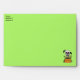This invitation sized envelope is perfect for your Halloween party invites. The envelope is bright green with a spooky white skull with a menacing face on the front who has tree branches for arms and holding an orange sign that says beware. the skull is also on the back flap holding a sign that says Halloween Party which you can customize the template along with your return address on the front. The inside of the envelope is white with bright green polka dots.