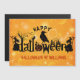 Cute creative happy Halloween concept design where letters are made of halloween symbols. Spooky trees, witches, black crow, flying bats, etc. Yellow orange texture with customizable and optional text.
