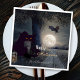 Haunted Halloween paper napkins featuring a nocturnal landscape with black cat, a spider and bat at full moon. In the tree are subtle party lights.