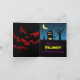 A spooky haunted house with a grave marker in the backyard, a creepy dead tree with a hangman's noose, flying bats, a ghost, a quarter moon with an owl perched on it, a black cat and raven, all against a dark blue sky. Very fun and scary design for your Halloween greeting card.