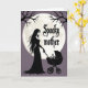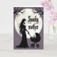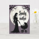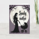 This design shows a tall, stylized woman in a long, fitted black gown that trails into a jagged hem, giving her silhouette a dramatic, romantic edge ❤️. Her long dark hair streams outward like windblown branches, echoing the bare, skeletal trees that curve in from above. She wears a small, knowing smirk, as if sharing a private joke with someone just out of view. In front of her, she gently guides a classic baby pram in matching black, and the careful tilt of her posture makes the moment feel oddly tender. Inside the pram, two pale skeletal hands reach up from the shadows, their white bone details standing out sharply against the dark interior, adding a cheeky, eerie twist 🌼. A large full moon fills much of the upper background, glowing softly over a muted lavender sky and casting a faint, ghostly light across the scene. The words “Spooky mother” sit above the figures in black, ornate lettering, centered near the top of the card. Thin, crooked tree branches frame the moon like a natural arch around the woman and the pram.