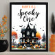 Spooky One 1st Birthday Party Sign. Welcome your guests in style with this fun and festive party sign, perfect for a boy or girl’s first birthday. At the top, the phrase “Name Is A Spooky One” is displayed in a mix of playful script and simple fonts. The center features a black and white haunted house accented with orange pumpkins, jack-o’-lanterns, and spooky trees, with whimsical ghosts and bats for extra charm. Ideal for greeting guests and creating a festive Halloween birthday vibe.