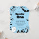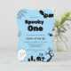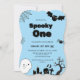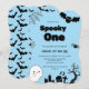Halloween themed girl's birthday party invitation card with illustrations of a ghost, spider, bat, and candles. The title is "Spooky One."