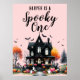 Spooky One 1st Birthday Party Sign. Welcome your guests in style with this fun and festive party sign, perfect for a little girl’s first birthday. The background is blush pink, and at the top, the phrase “Name Is A Spooky One” is displayed in a mix of playful script and simple fonts. The center features a black and white haunted house accented with a mix of pink and orange pumpkins, jack-o’-lanterns, and spooky trees, with whimsical ghosts and bats for extra charm. Perfect for greeting guests and creating a festive Halloween birthday vibe.