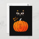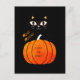 Big eyes black cat standing behind an orange pumpkin on dark background, with the phrase "Trick or Treat" and saying "Boo Meow". Very cute and spookily spooky for Halloween. You can change the texts and personalize to your liking..
