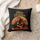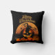 Halloween themed pillow featuring spooky pumpkins, black cats, bats, spiders and full moon on black background with Happy Halloween greeting.