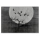 A flock of black ravens in silhouette fly over a spooky desolate landscape in front of a full moon.
